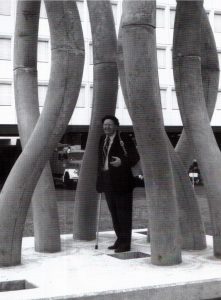 1974년 자신의 조형물 “불꽃” 속에 들어 가 포즈를 취한 에른스트 크라머. 출처: Udo Weilacher 2001 [237]