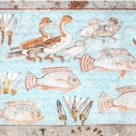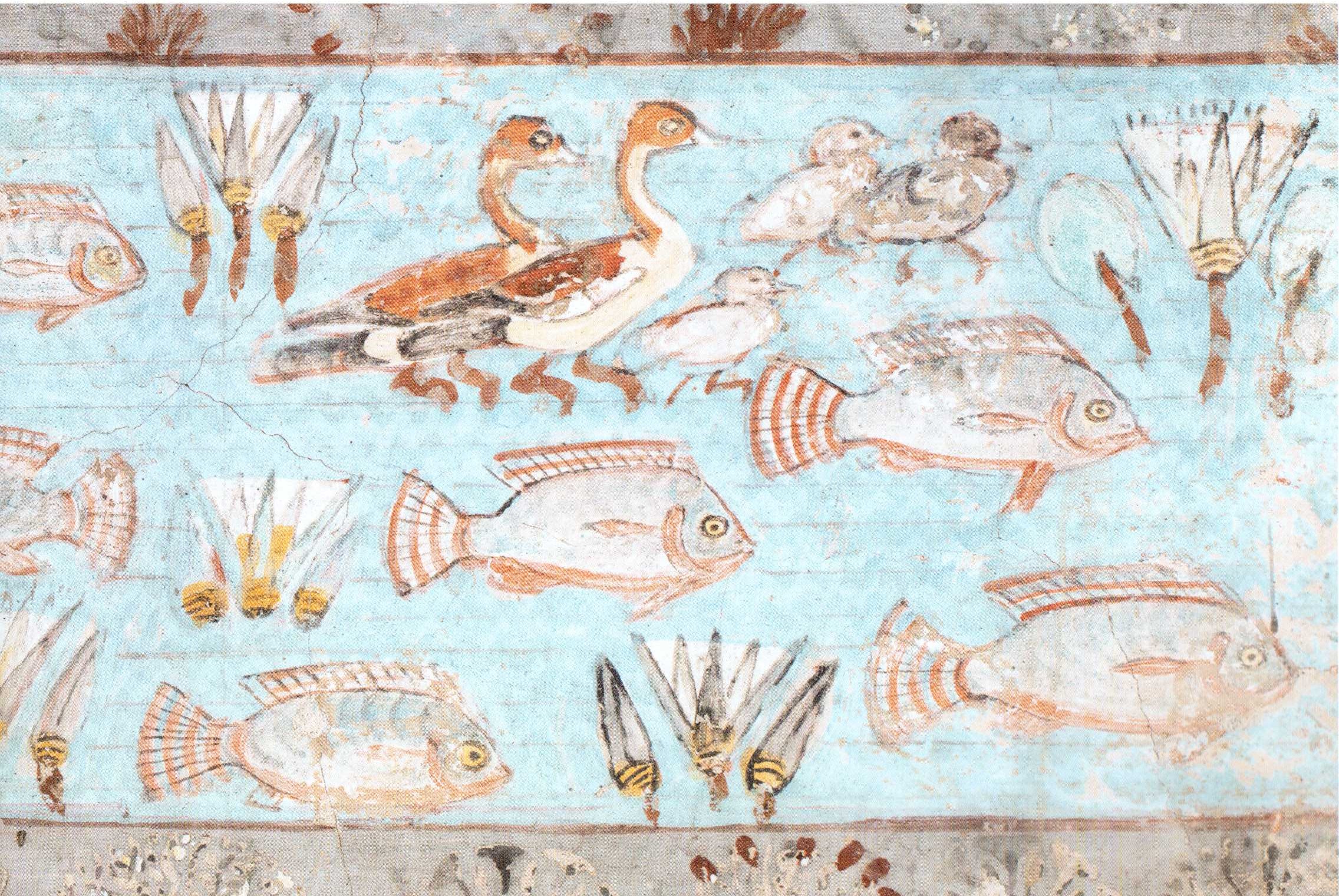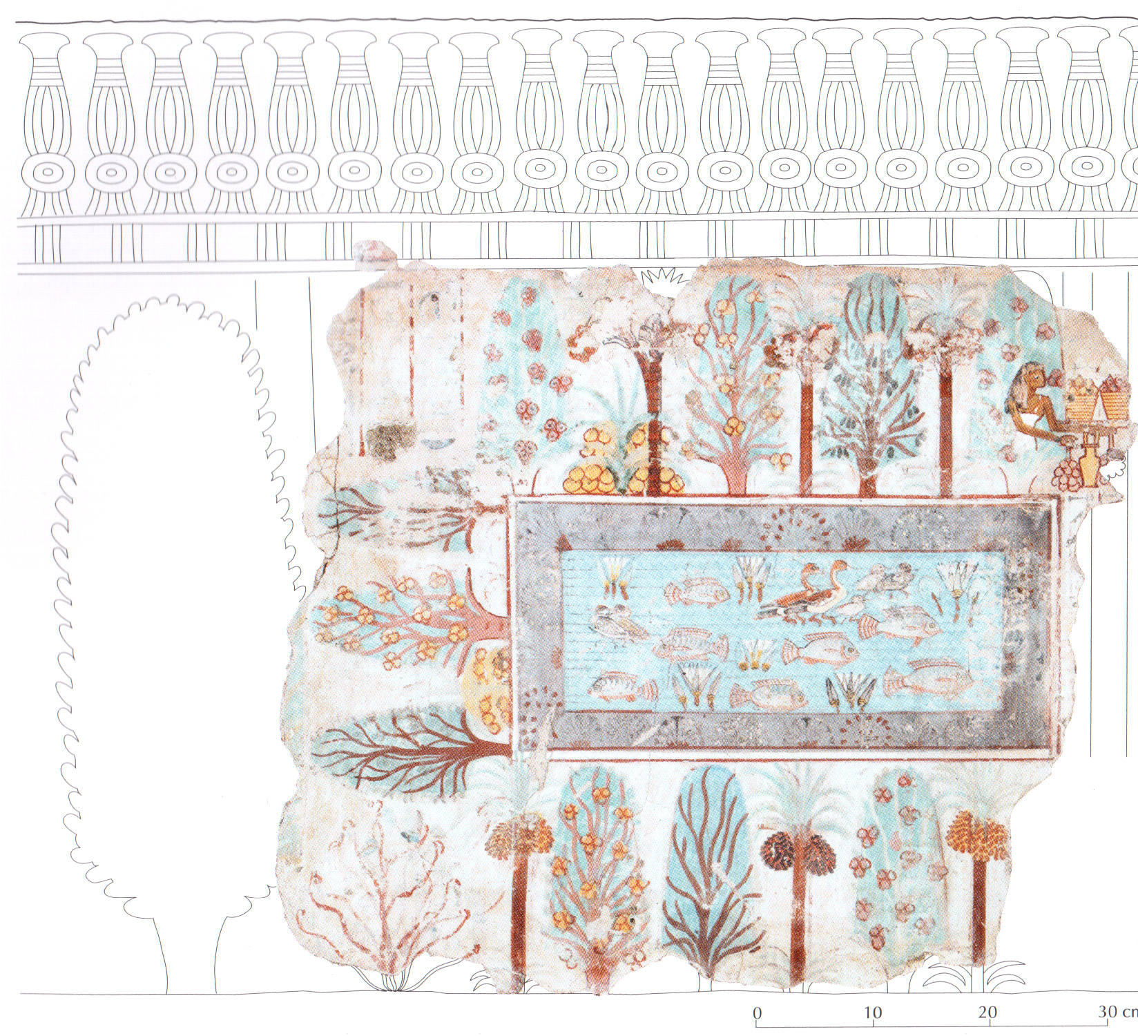 중앙에 연꽃이 피어있는 장방형의 대형 연못이 있다. 연못에는 물고기들이 가득하며 오리 두 마리, 이집트 거위 두 마리와 새끼거위 세 마리가 헤엄치고 있다. 물고기는 틸라피아Tilapia라고 하는 아프리카에 흔한 물고기일 것으로 추정된다. 연못가에는 파피루스 외에 여러 식물이 자라고 있는데 확실치는 않지만 빨간 꽃이 반원형으로 배치된 것은 양귀비일 것이며 흰 꽃이 핀 것은 캐모마일Artemis cotula이거나 개꽃아재비Artemis arvensis일 것으로 추정된다. 나머지는 콘플라워일 수 있다. 이 꽃들이 자라는 연못가는 지금 회색으로 변했지만 본래 녹색이었다. 주변을 두르고 있는 흰줄은 연못가 화단의 경계를 나타낸다.