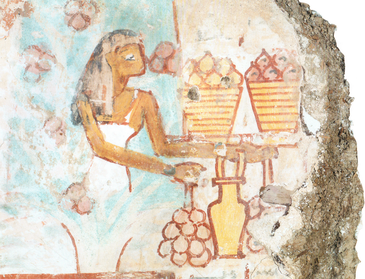 • 그 사이사이에 돌무화과 나무Ficus sycomorus (빨간 열매)와 무화과 재배종 Ficus carica (노란 열매)가 각각 서 있다.