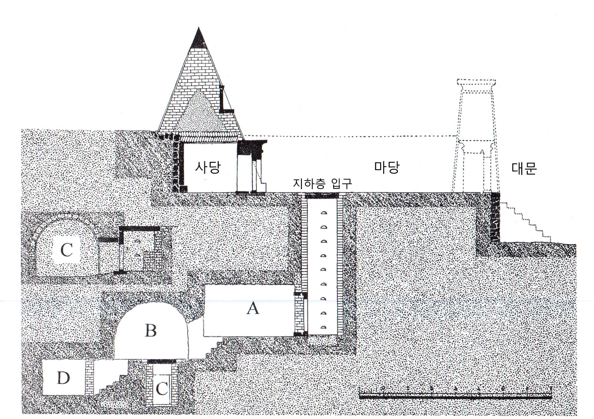 고대 이집트 석묘의 구조. 그림은 세네디젬의 무덤이지만 네바문의 무덤과 기본적으로는 흡사했을 것이다. Shedid 1994, p. 21. modified by JHG.