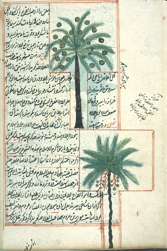 카츠비니 우주론 중 피조물 식물편, 대추야자 항목. 필사본. MS P 1, fol. 30a. 인도에서 1537년경에 필사된 것으로 추정. Source: Islamic Medical Manuscripts at the US National Library of Medicine