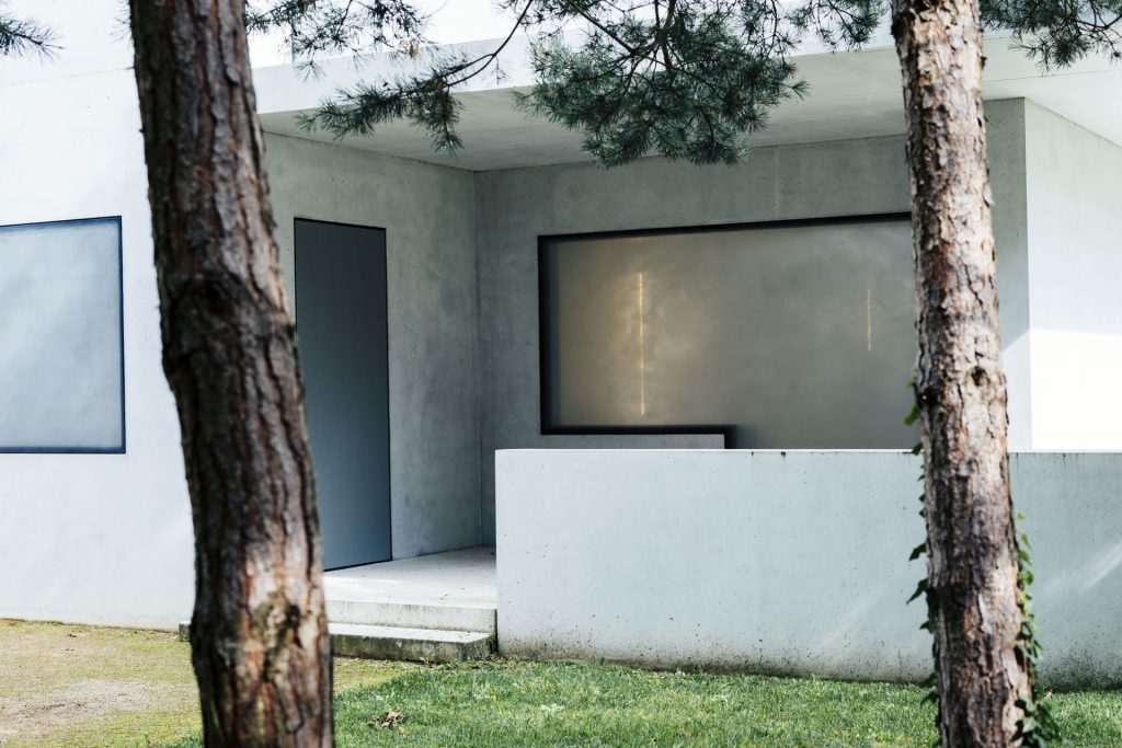 조경 콘셉트는 단적으로 완벽한 미니멀리즘이라 할 수 있다. 소나무 숲의 매력을 십분 활용하여 소나무를 제외한 일체의 식물을 배제했다. 집 앞에 사각형의 잔디밭을 조성한 것이 전부다. 잔디밭 위에 드물게 소나무를 세워 두어 소나무의 길고 검은 기둥과 백색 입방체의 건축 미학을 첨예하게 대비시켰다.